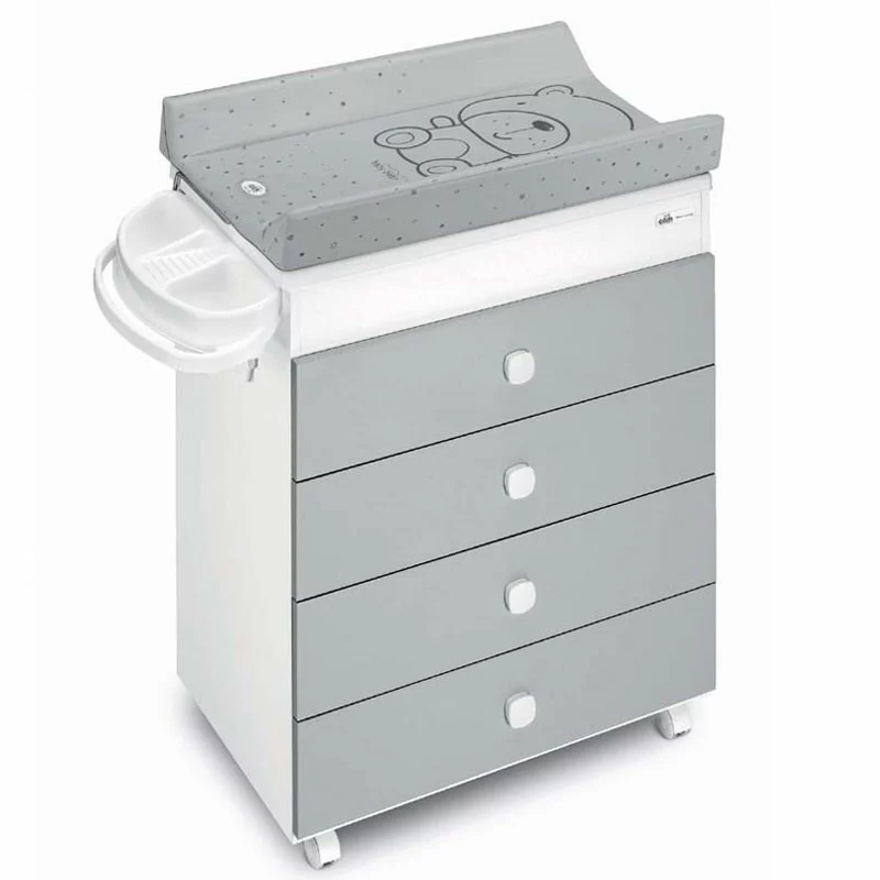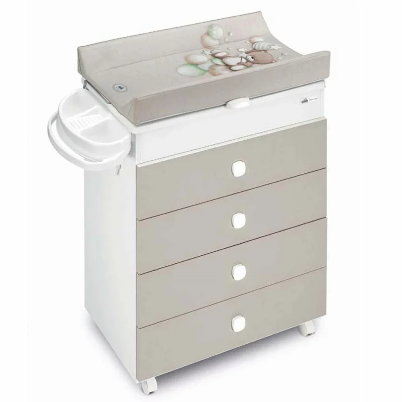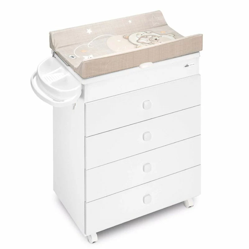 Cam Cassettiera Asia con Fasciatoio e Vaschetta per Neonati è un pratico e funzionale mobile-fasciatoio imbottito, con sistema anti-ribaltamento. Include una vaschetta con 2 sedute anatomiche, una seduta inclinata per bambini fino ai 6 mesi, e una seduta per neonati da 6 ai 12 mesi. Le guide in metallo permettono di aprire facilmente i cassetti, molto ampi e utili per riporre tutti gli indumenti e accessori del bambino. Il fasciatoio è fornito di vani portaspugna e portasapone, mentre le 4 ruote facilitano ogni spostamento della Cassettiera Asia. Incluso coperchio in legno per funzione mobiletto.