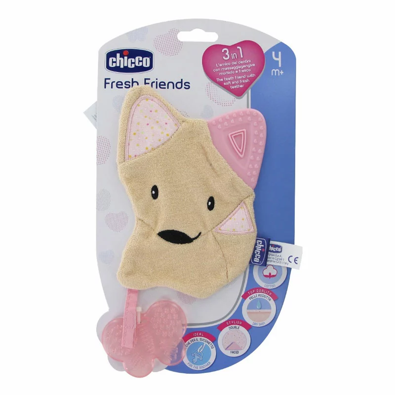 Massaggiagengive Fresh Friends 3in1 di Chicco è un innovativo gioco che unisce un morbido dentaruolo con un massaggiagengive fresco e refrigerante che aiuta a lenire i fastidi alle gengive causati dalla dentizione. Il suo cotone morbido e assorbente è efficace contro le perdite di saliva e mantiene la pelle sempre asciutta. Funge anche da portaciuccio.
