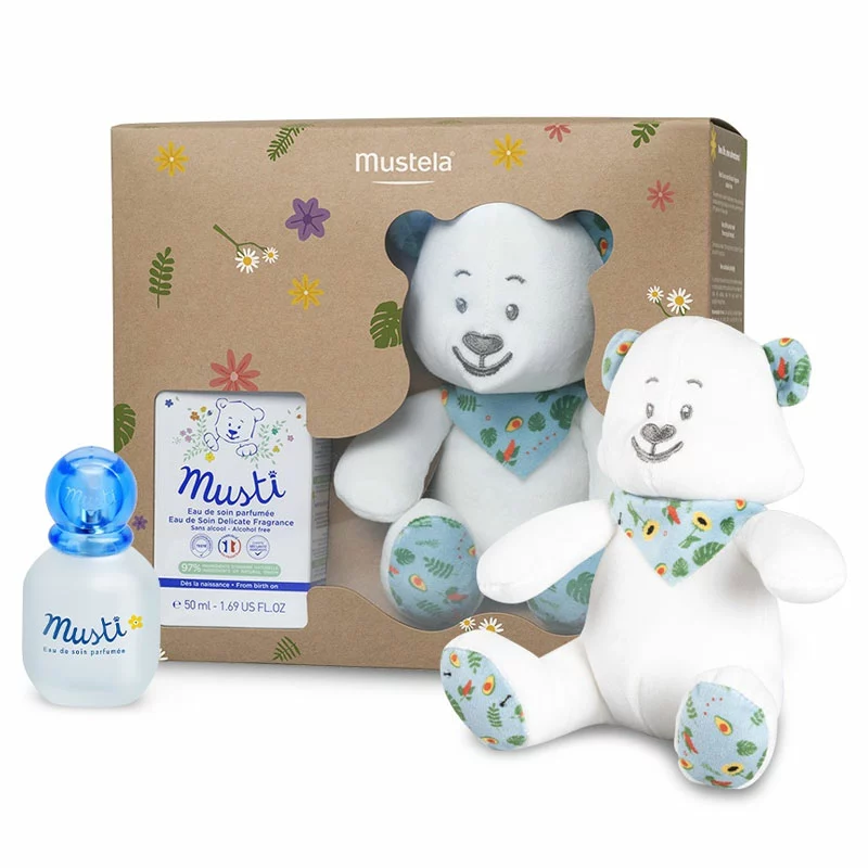 Mustela Cofanetto Regalo Mustì con Acqua Profumata e Orsacchiotto di Mustela è un grazioso cofanetto regalo, perfetto come regalo di auguri per i neogenitori e il neonato! Include un Acqua Profumata Mustì 50ml, ossia un’acqua senza alcool arricchita da da un mix di assenze aromatiche tra cui fiori bianchi, bergamotto e mughetto, delicata e ideale per curare con dolcezza la pelle del bambino. Questo aroma viene arricchito di estratti di miele e camomilla, dalle note proprietà nutritive e calmanti. Insieme all’Acqua Profumata è compreso un dolce Orsacchiotto bianco con zampe, orecchie e bandierina al collo colorate. L’orsacchiotto è realizzato in plastica riciclata per un impatto ecologico più leggero.