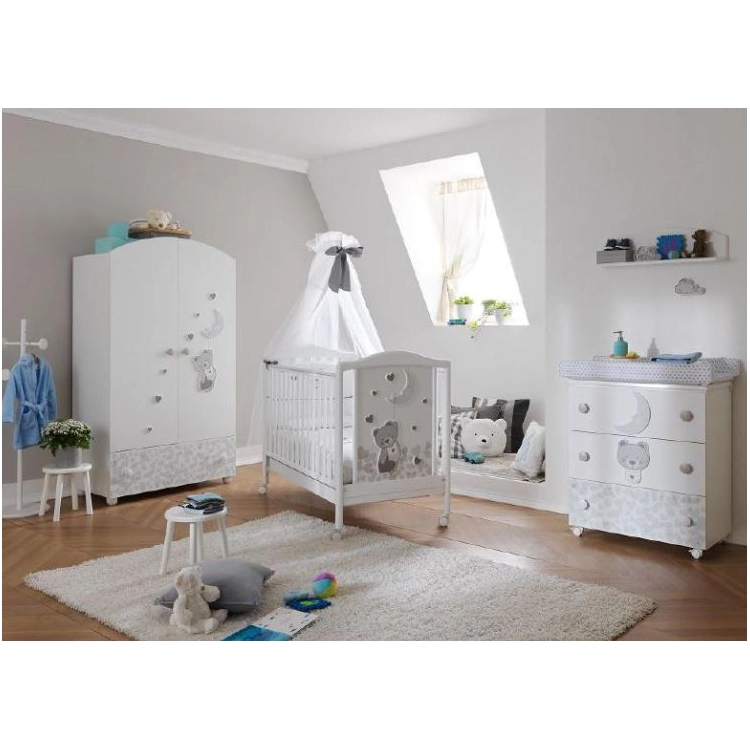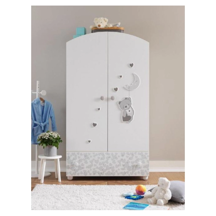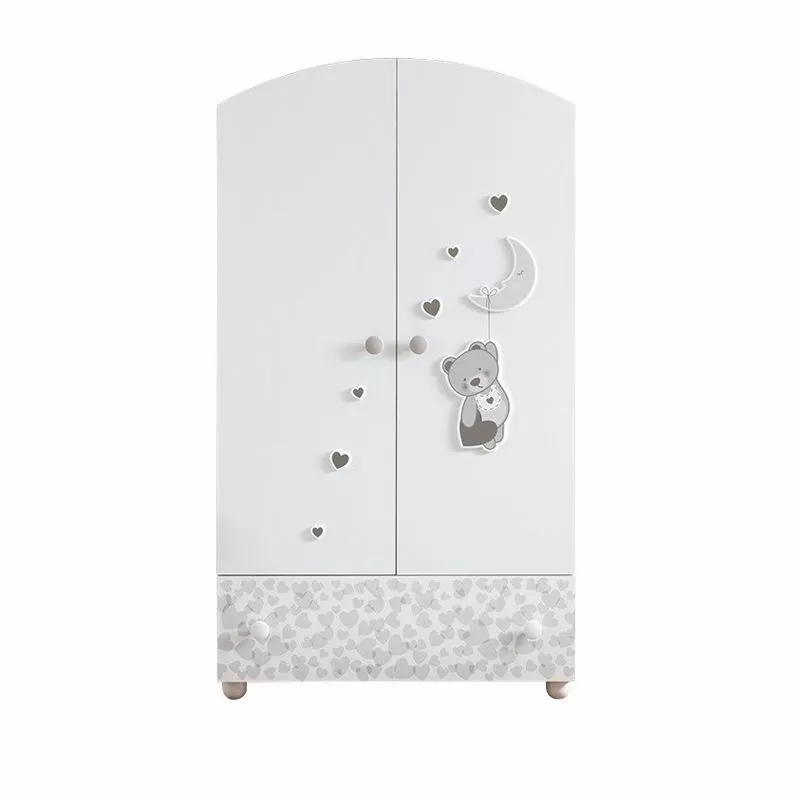 L’Armadio Moon della Pali è l’ideale per arredare con gusto la cameretta del bebè ed è adatto per ogni mamma che desidera un ambiente ben organizzato dove prendersi cura del proprio bambino. É composto da una solida struttura in legno a due ante con pomoli tondi ed è abbellito con decori in rilievo raffiguranti cuori, luna e orsachiotto simboli della collezione Moon. L’Armadio Moon è dotato di ampio cassetto esterno decorato mentre l’interno è diviso in 2 parti: una per appendere i vestiti e l’altra parte attrezzata con mensole, tutto incluso.