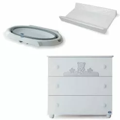 Pali Comò Birba Plus con Vaschetta Removibile per Bagnetto e Fasciatoio aggiunge un tocco di dolcezza in più alla cameretta del tuo bambino! Aiuta a mantenere ordinata la stanzetta grazie ai 3 cassettoni di cui è dotato. Realizzato in legno color bianco, Comò Birba è dotato di pomelli e un piano d’appoggio superiore su cui installare la vaschetta richiudibile per il bagnetto o il fasciatoio per il cambio. Il cassetto superiore è decorato con un dolce orsetto!