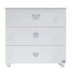 Il Comò Birillo è composto da una solida struttura in legno con 3 ampi cassettoni ed ogni cassetto è dotato di due pomoli a forma tonda ed è abbellito con decori in rilievo raffiguranti un orsacchiotto, una stella ed un cuore.